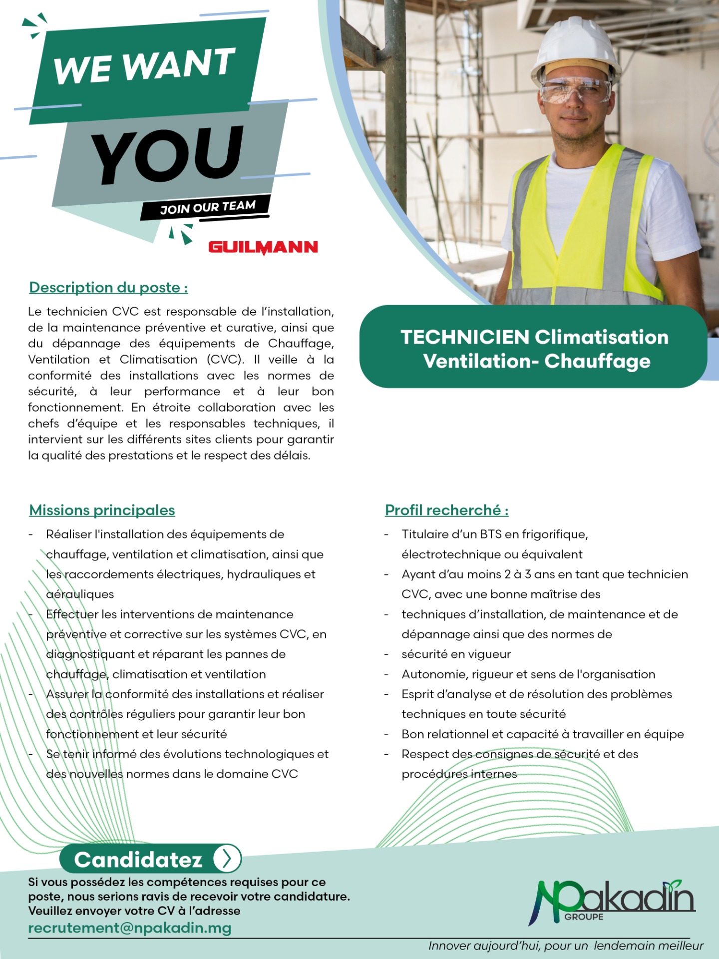 - Ayant d'au moins 2 à 3 ans en tant que technicien CVC, avec une bonne maîtrise des techniques d'installation, de maintenance et de dépannage ainsi que des normes de sécurité en vigueur